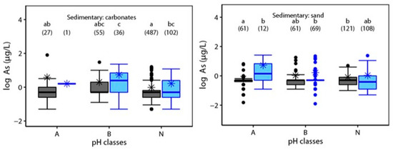The Kruskal–Wallis test was used to evaluate the effect of pH and redox on trace element concentrations for each element (Figure S1). Reduced water predominates in Denmark, whereas oxic water is predominant in Loire-Bretagne. However, As is affected by the redox class, as illustrated in Figure 5 for sedimentary aquifers, whereas pH is not discriminant.