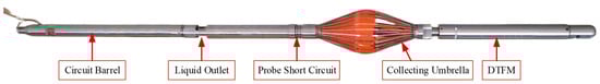 Figure 2 shows the DTFM physical diagram designed for feasibility experiment. The device is composed of circuit barrel, liquid outlet, probe short circuit and collecting umbrella from left to right. The hardware part of the experiment was placed in the circuit barrel. The liquid outlet can flow the collected liquid out of the measuring device and into the wellbore through this hole. A probe is placed in the probe short circuit, and the probe is composed of a speed sensor and a temperature sensor. The function of the collecting umbrella is to close the annular space between the measuring device and the wellbore, so that all the fluid flows through the measuring channel of the prototype, and at the same time to improve the velocity of fluid. The DTFM is used for flow measurement by flow collection. The outer diameter of the prototype is 28 mm and the inner diameter is 20 mm.