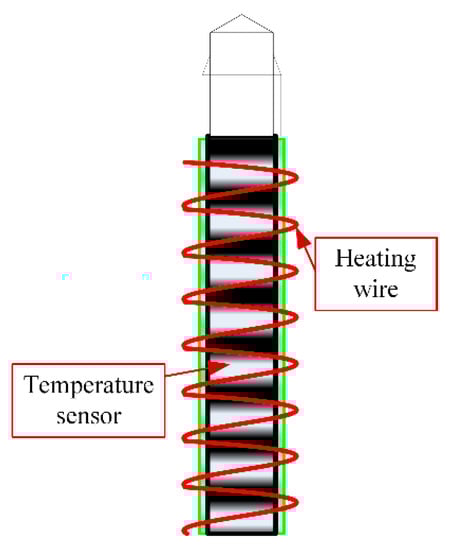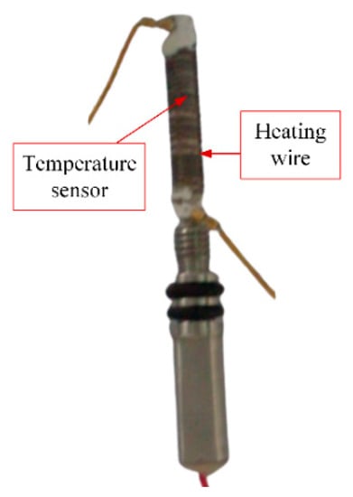 The DTMF probe is shown in Figure 5. The temperature sensor one is wrapped with a heating wire, and ceramic isolation is used between the heating wire and the thermistor to prevent the heating wire directly heating the thermistor. The temperature sensor two is used to measurement the environment temperature. The temperature sensor one and tow are platinum resistance PT1000.