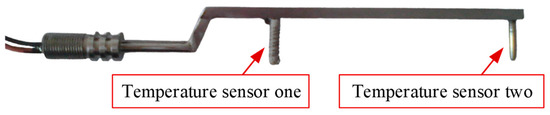 Figure 3 shows the speed sensor, which is composed of heating wire covered with thermistor. Figure 4 shows the actual figure of the velocity probe. Using DC power analyzer Agilent n6705b (Keysight Technologies, Santa Rosa, CA, USA) to provide constant current for resistance heating wire. The temperature sensor used in the DTFM is composed of armored temperature sensitive platinum resistor (PT1000). Fluke pm6306 LCR measuring instrument (Fluke industrial, Almelo, the Netherlands) is used to measure the resistance of platinum resistance in real time. The resistance wire is heated under a certain power and the power is kept constant. The temperature sensor detects the temperature of the liquid phase flow at the heating wire.