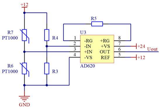 The chip of signal acquisition module is AD620 (ADI, Norwood, UK). The resistance of AD620 is 11 KΩ. According to the formula , the magnification is about 5.5 times. The front end of AD620 is connected with a bridge composed of two temperature sensitive resistors and two high-precision fixed resistors with equal resistance. Two temperature measuring thermistors are symmetrically distributed on both sides and form a Wheatstone bridge with two external resistors. When there is fluid flowing through, the temperature near the heating resistance wire will be higher than the temperature behind, which will change the resistance of the two thermistors, destroy the balance of the measuring bridge and produce the output voltage (uout) corresponding to the resistance change. The relationship of uout between R6 and R7 is