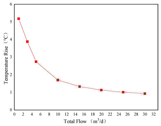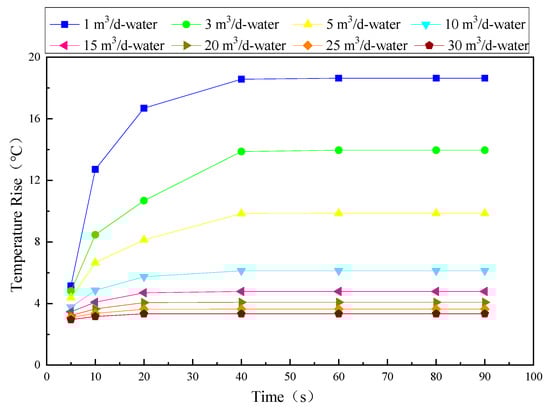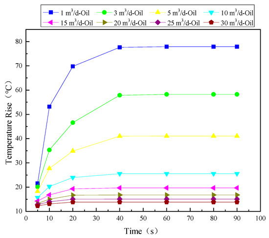 Setting the input phase as oil, the power as 36 W and the inlet flow rates as 1 m3/d, 3 m3/d, 5 m3/d, 10 m3/d, 15 m3/d, 20 m3/d, 25 m3/d and 30 m3/d, respectively, for simulation. When the heating wire is heated to 5 s, 10 s, 20 s, 40 s, 60 s, 80 s and 90 s, monitor the temperature rise and draw the temperature rise calculated by simulation as shown in Figure 13. It can be seen from figure that it is similar to the curve when the medium is water. In the simulation, the medium in the pipe is changed to oil, and the relevant parameters such as density and viscosity are also included. The temperature rise is different at different times under different flow rates, but the rising trend of temperature is basically the same as that in water. The value of temperature rise is different, and the value in oil is obviously greater than that in water. When the heating time is within 40 s, the temperature rise is faster than 40 s and it is slower than 40 s. After 40 s, the temperature rise is basically in a stable state, but there are also small changes.