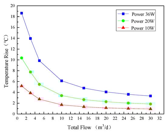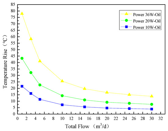 Changing the medium in the pipe to oil, and the heating power of heating wire is 10 W, 20 W and 36 W, respectively. The initial temperature of oil in the pipe is set to 25 °C (298 K), and the other settings are the same as when the medium is single-phase water. As shown in Figure 11, the law curve of temperature distribution trend and flow rate when the medium is oil. The overall trend decreases with the increase of flow rate, the temperature rise decreases and the degree of reduction is different. The higher the heating power, the greater the temperature rise; the smaller the heating power, the smoother the curve of temperature change. It can also be seen that the curve is almost horizontal when the flow rate is more than 20 m3/d, and the resolution is low at this time. The curve changes significantly when the flow rate is less than 20 m3/d, and there is a good flow resolution. It can be seen that this device is more accurate for measuring low flow.