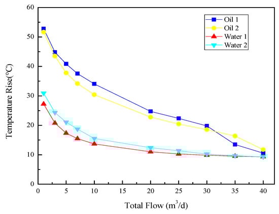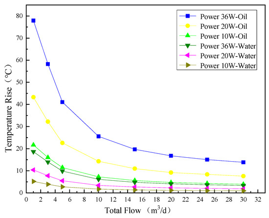 Curve of temperature rise changing with flow rate in water and oil.