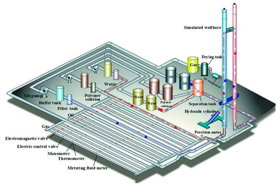 In this paper, the Dynamic experimental of oil-gas-water multiphase flow were carried out on the experimental facility of oil-water two-phase flow in Daqing Oilfield, which consists of transparent simulated wellbore with length of 8 m, inner diameter of 125 mm, overhead tank, oil tank, water tank, water pump, oil pump, oil-water separation tank, air compressor, gas purification device, gas stable pressure tank and the console, as shown in Figure 15. The blue simulated wellbore is the experimental wellbore, the pink wellbore is the recycle wellbore. Finally, water and oil flow into the recovery wellbore through the experimental wellbore, forming a circulation system.
