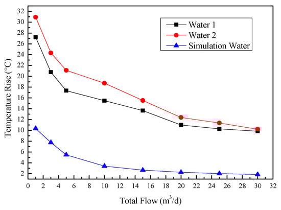 Curve of temperature rise with time at different flow rates in water.