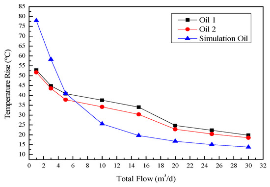 Curve of temperature rise with time at different flow rates in oil.