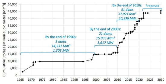 Our temporal water quality findings suggest that dam development is a driver of water pollution. Similar findings have been revealed elsewhere, for example, in Asia [,], Africa [], and Europe []. Dams detrimentally affect biodiversity, hydrology, and water quality [,]. In the LMB, there has been a rapid increase in hydropower dam development. By the end of the 1990s, nine hydropower dams were commissioned, with ~14,531 Mm3 of reservoir storage and 1303 MW of installed capacity. The number doubled by the end of the 2000s (21 dams, ~15,933 Mm3 and 3617 MW), and increased six-fold by the end of the 2010s (51 dams, ~37,921 Mm3 and 10,236 MW) (Figure 1). Water storage and dam operations impact water quality by trapping sediment and nutrients behind dams, and altering water temperature and dissolved oxygen dynamics []. Moreover, regulated upstream flows and sediment trapping drive sea water intrusion into the Mekong Delta []. This in turn increases chloride concentration, further degrading water quality [,].
