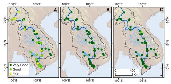 Macroinvertebrate and physical-chemical sampling to assess water quality is scarce in the LMB, particularly at a large spatial scale. Moreover, a scientific comparison of water quality indices through time has never been conducted for the LMB. The only existing study of water quality throughout the basin is from Chea et al. [], which revealed more water quality degradation in tributaries than mainstem rivers, and from Mekong River Commission (MRC) technical papers, which reported “good” water quality across most of the basin [,]. Other water quality studies have been limited to smaller areas of the LMB using either aquatic organisms or physical-chemical parameters, and include Wilbers et al. [] and Phung et al. [] in the Mekong Delta, Oeurng and Sok [] in the 3S rivers, Sor et al. [] in the upper Cambodian Mekong, Tian et al. [] in Mun River, and Kudthalang [] in Chi River.