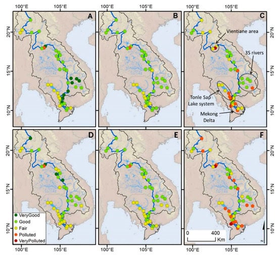 Based on biotic and abiotic assessment indices, water quality of the LMB was generally good in the 2000s, especially when compared to several other major rivers in Asia such as the Chao Phraya in central Thailand [], the Red River in Vietnam [], and the Yangtze [] and Yellow Rivers [] in China. Moreover, upstream tributary rivers such the 3S had better water quality and biological diversity, measured as invertebrate family richness and abundance, than mainstem rivers, indicating that in the 2000s, the upstream tributary ecosystems were healthier than those of mainstem rivers. Nevertheless, current water quality across the LMB has generally degraded compared to the 2000s (Table 5). This finding supports the results of Chea et al. [] that most parts of the LMB are experiencing noticeable water pollution, particularly degrading water quality near Vientiane, in the 3S rivers, Tonle Sap Lake system, and the Mekong Delta (Figure 3).