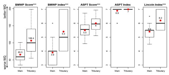 Biotic indices showing water quality between mainstem and tributary sites sampled in 2000s. Red dots indicate the mean values of each corresponding index. WQ: water quality. *** indicate statistically significant differences at p < 0.001.