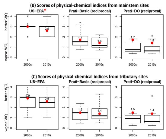 Water quality change from the 2000s to 2010s, based on abiotic indices at all sites (A), mainstem sites (B), and tributary sites (C). * and ** (in red) indicate statistically significant differences at p < 0.05, and p < 0.01, respectively. Red dots indicate the mean value for each index. WQ: water quality.