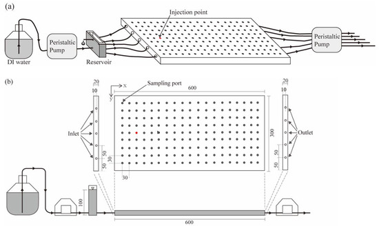 Plume tests were performed in a two-dimensional physical aquifer model (Figure 1) which was constructed using polycarbonate with dimensions of 60 cm (L) × 30 cm (W) × 2 cm (H). Five ports with a diameter of 10 mm were positioned at 5-cm regular intervals on the left and right sides of the model to induce inflow and outflow during plume tests, respectively. Sampling ports of 171 units with a diameter of 7 mm were installed at the top of the aquifer model with a grid of 9 × 19 and capped by Teflon-coated rubber cap. To minimize air entrapment, the aquifer model standing in the longitudinal direction was filled with background liquid and then was uniformly packed with sandy soil, which mainly consisted of quartz (Jumunjin silica, Korea). Mechanical sieving of sandy material was performed using US Standard Sieves (Fisher Scientific, Waltham, MA, USA) No. 30 and No. 10 to obtain sand fractions (0.6~2.0 mm). Before experimental use, the sandy materials were washed using deionized water three times and autoclaved twice at 121 °C for 15 min to prevent any influence by other microorganisms. The bulk density and porosity of the sandy soil were determined to be 1.54 g/cm and 0.35, respectively. The sand was analyzed using an X-ray diffraction technique and was found to be mainly composed of quartz with very little organic carbon (<0.05%) [36].