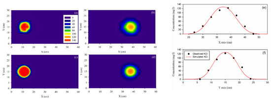 KCl plumes (unit of contour mg/L) observed (a) at the initial stage, (b) after 24 h; the simulated plumes (c) at the initial stage and (d) after 24 h; and (e,f) cross-section of concentration along the x- and y- axes after 24 h.