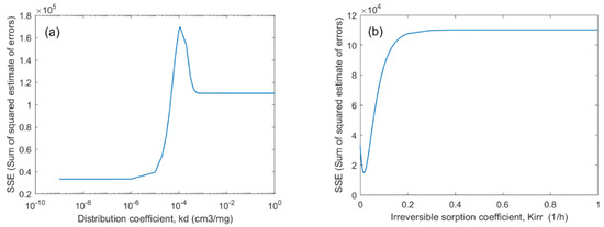 Goodness of fit in the simulations of toluene transport using (a) the linear isotherm model, (b) the kinetic-irreversible model. The curve shows the change in SSE (sum of squared error) according to the value of the adsorption parameter.