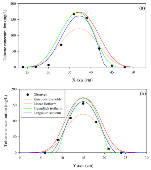 In Figure 6, the observed distribution of the toluene plume and the distribution simulated using optimized sorption parameters are compared using cross-sectional views in longitudinal and transverse directions. The irreversible kinetic sorption model showed lower peak concentrations, whereas the linear isotherm model showed higher distributions than the observed concentrations. The Freundlich isotherm and the Langmuir isotherm showed lower concentration distributions at the edges of the contaminant plume than the irreversible kinetic sorption model and the linear isotherm model. Among these models, the Langmuir isotherm model showed the curve that was closest to the observed values.