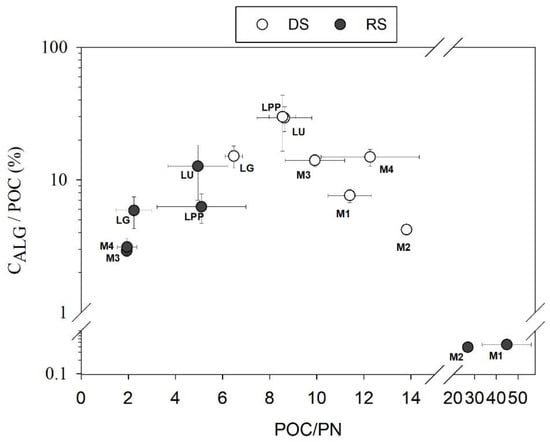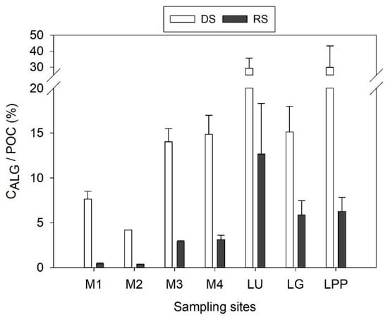 The CALG/POC averaged 11.6 ± 10.2%. It averaged 17.7 ± 10.3% in the DS and 5.1 ± 4.6% in the RS. Although the CALG/POC was higher in the DS compared to in the RS (U-test, p < 0.001), it remained below 50% (Figure 4) in both seasons. The algal contribution to the POC was higher in the lower basin in both seasons (DS: t-test, p < 0.05; RS: U-test, p < 0.001; Figure 4).