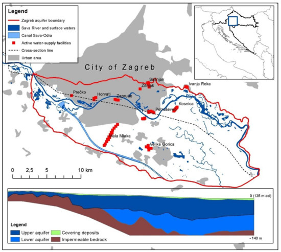 The Sava River is the largest tributary of the Danube River. The springing zone is located in Slovenia and has a confluence with the Danube River near Belgrade in Serbia. It flows through Croatia for a large part of its course and forms the border between Croatia and Bosnia and Herzegovina in the eastern part of Croatia. In the wider area of Zagreb, Croatia, it flows through a deep and irreplaceable aquifer that forms the basis of the water-supply of Zagreb and the neighboring cities and settlements. It is composed of predominantly well-permeable gravels with interlayers of watertight or poorly permeable fine-clastic sediments. This aquifer complex is called the Zagreb aquifer, and it is practically the only real groundwater reserve of Zagreb (Figure 1).