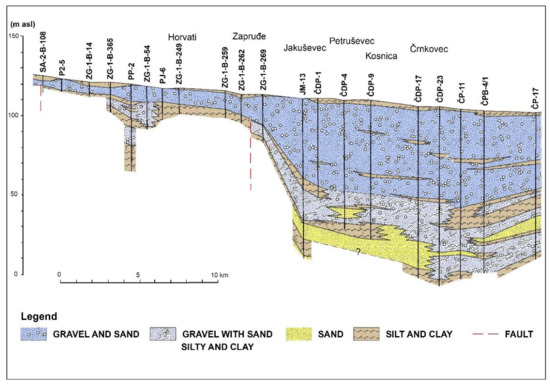 The Zagreb aquifer formed during the Middle and Upper Pleistocene when this area was a lake or a swamp area. From the surrounding land area, through the processes of erosion and denudation, the deposits were eroded and washed away by numerous streams into that lake or swamp area. At the beginning of the Holocene, the Sava River breached and then the transport of materials from the Alps began. The water inflow in the hypsometrically lower Zagreb basin led to a drop in water energy and the creation of accumulation conditions with the deposition of a large amount of predominantly well-permeable gravel up to 60 m thick, above the previously deposited finely grained swamp sediments (Figure 2). This contributed to the additional vertical separation into two aquifers having different hydraulic characteristics, separated by impermeable or poorly permeable deposits [23,24].