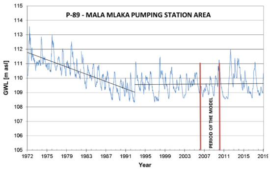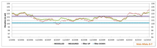 For the period of the mathematical model, a period of five years was chosen (2006–2010) in which there were no large water level variations, i.e., when groundwater levels were low but steady (Figure 5).