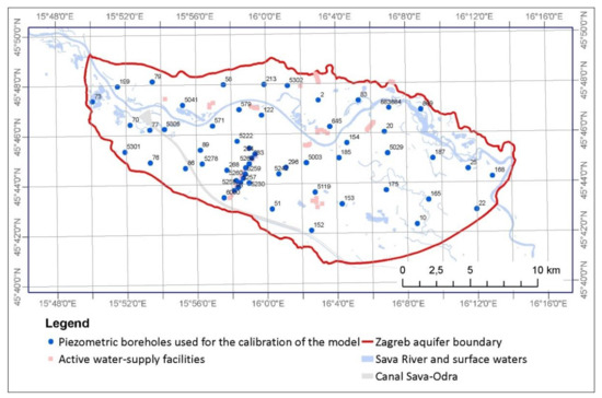For calibration purposes, 53 evenly distributed piezometers were selected throughout the Zagreb aquifer, and special attention was paid to the narrower area of the Mala Mlaka water pumping station, where piezometers located next to the wells were selected as calibration points (Figure 7).