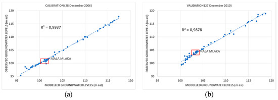 In the process of model calibration, the biggest challenge was to achieve the best possible match between the model and the actual state, comparing the simulated (modeled) water level values at the control points with the actually measured water levels at these same points. This was largely successfully achieved by adjusting the model parameters during the calibration process: hydraulic conductivity, transfer rate parameter for the Sava River, marginal inflows, the influence of precipitation, and other factors. With each change in an individual parameter, the model was restarted until satisfactory results were achieved. The analysis showed satisfactory results with the coefficient of determination (R2) value of 0.9937 (Figure 8a) and the root mean square error (RMSE) value of 0.3312.