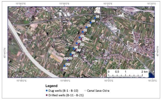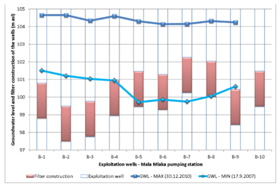 The exploitation wells B-1 to B-10 of the Mala Mlaka water pumping station (Figure 9) were built during the 1960s and 1970s when the groundwater levels of the Zagreb aquifer were up to 5 m higher than today [11]. Then, the filter constructions were defined so that the upper elevations of the filter constructions were 1–3 m below the groundwater level in the dry period. However, the upper elevations of the filter structures nowadays remain in the unsaturated aquifer zone during dry periods as a result of the lowering of the groundwater levels in individual wells, significantly reducing the capacity of these wells. Therefore, at the end of the 1980s, the construction of additional drilled wells of greater depths (B-15, B-16, B-17, B-18, B-19, and B-21) began with the above-mentioned dug wells (Figure 9). From them, water is pumped into dug wells during low groundwater levels because there are pumps in the dug wells that are connected directly to the water-supply system.