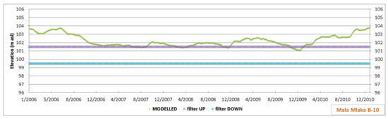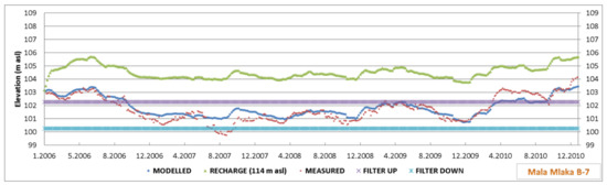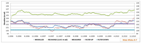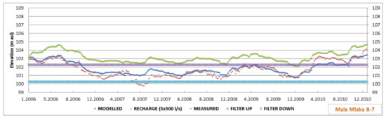 The influence of the MAR facility with a constant water level at an elevation of 115 m a.s.l. is important for the wider area of the Mala Mlaka water pumping station. The impact on well B-7 of the Mala Mlaka water pumping station is an increase in groundwater levels by about 4 m. Applying the MAR with a water level in the Sava-Odra Canal of 115 m a.s.l. the groundwater levels would be about 3.2 m above the upper edge of the filter (Figure 15).
