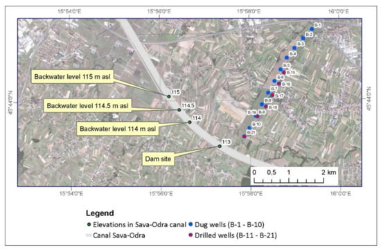 Due to the need for large amounts of water in the Sava River, the option of building a dam with a height of about 2 m in the Sava–Odra Canal at the height of the Mala Mlaka water pumping station of 113 m a.s.l. was considered (Figure 13). This dam would ensure the constant presence of water in the canal in the narrower area of the Mala Mlaka water pumping station. The MAR was simulated for water levels in the canal of 115, 114.5, and 114 m a.s.l. which enable a water level in the canal of 1–2 m in the immediate zone of the water pumping station.