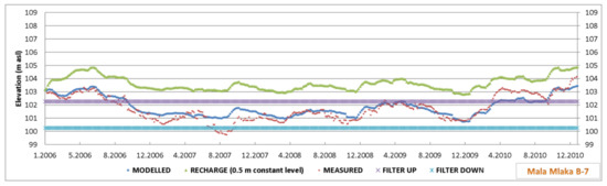 The impact of the Sava-Odra Canal under the condition of a constant water level in the canal of 0.5 m did not have as strong an impact on the Mala Mlaka water pumping station as on the wider area, i.e., the relatively wide zone around the canal. The impact on well B-7 of the Mala Mlaka water pumping station is an increase in groundwater levels by about 1.8 m. This well experiences many problems during low groundwater levels because the groundwater level falls below the upper edge of the filter construction, and during the extreme dry periods, the whole filter construction remains dry. Applying the MAR of the Sava-Odra Canal with a constant water level of 0.5 m, the levels would be about 0.5 m above the upper edge of the filter (Figure 14).