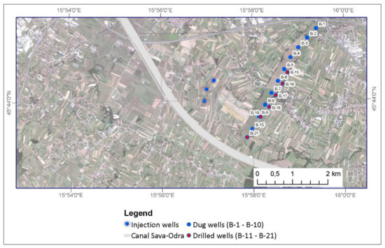 One of the considered options for artificial recharge is the construction of injection wells upstream of the exploitation wells of the Mala Mlaka water pumping station (Figure 18), which would ensure the self-purification of water before reaching the exploitation wells.