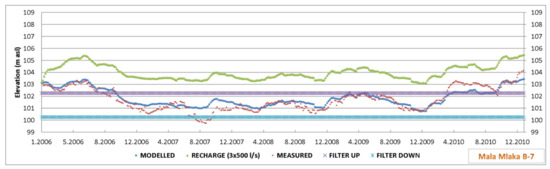 The influence of an artificial infiltration facility with a constant water level at an elevation of 114 m a.s.l. is the same on the wider area of the Mala Mlaka water pumping station. The impact on well B-7 of the Mala Mlaka water pumping station is the increase in groundwater levels by about 2.5 m. By artificial recharge with an elevation of 114 m a.s.l., the groundwater levels would be about 1.7 m above the upper edge of the filter during summer dry periods (Figure 17).