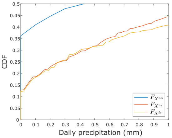 CDFs of the historical observations, historical simulations and future simulations used in this study for daily precipitation depths ranging between 0 and 1 mm.