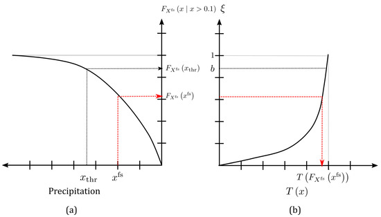 Overview of the distributions used in TDA: (a) CDF of the precipitation of the wet days in the future simulation, (b) CDF of the triangular distribution. The red arrow displays how a value is transformed into a value in the wet-to-dry case. The black arrow indicates the threshold value. Adapted from Pham [37].