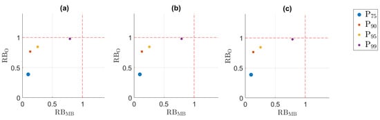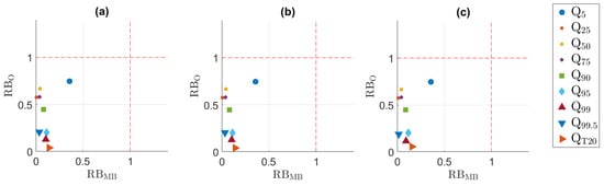 RBMB versus RBO for the precipitation intensity percentiles. (a) QDM, (b) SSR & QDM, (c) TDA & QDM.