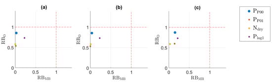 RBMB versus RBO for the precipitation occurrence indices. (a) QDM, (b) SSR & QDM, (c) TDA & QDM.