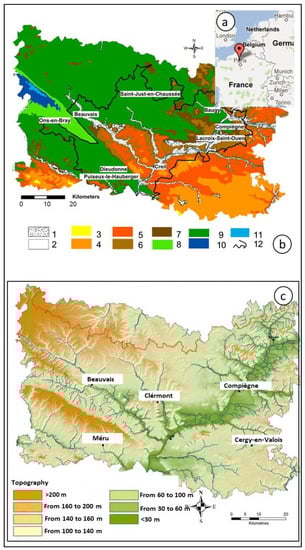 (a) Location of the study area, (b) geological characteristics of the Beauvais [], [1: Alluvium (Quaternary); 2: Anthropic embankments (Quaternary); 3: Upper and Lower Rupelian (Tertiary); 4: Upper and Lower Bartonian (Tertiary); 5: Lutetian = chalk, marl, and gravel (Tertiary); 6: Ypresian = ball clay and lignite of Soissons, sand of Cuise, and clay of Laon (Tertiary); 7: Thanetian = sand of Bracheux (Tertiary); 8: Lower Cretaceous from the Albian to the Neocomian (Secondary); 9: Upper Cretaceous from the Campanian to the Cenomanian (Secondary); 10: Portlandian Jurassic (Secondary); 11: Kimmeridgian-Sequanian Jurassic (Secondary); and 12: Limits of principal cities in Oise department], and (c) topography of the Oise department.
