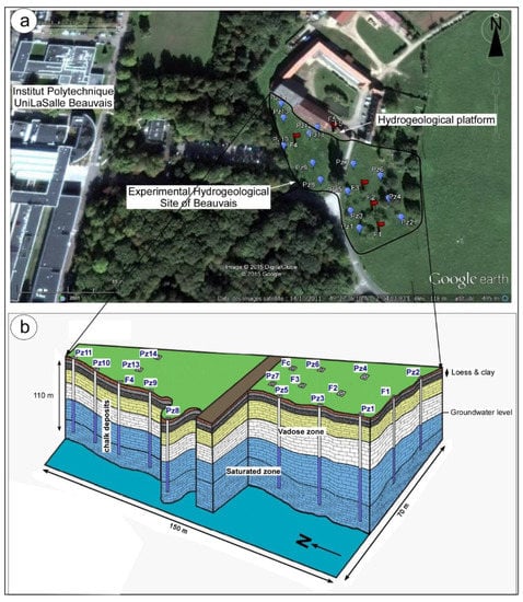 (a) Location of the experimental hydrogeological site of Beauvais (UniLaSalle) and of the hydrogeological wells; (b) 3D conceptual model showing the hydrogeological wells and the chalk aquifer system.