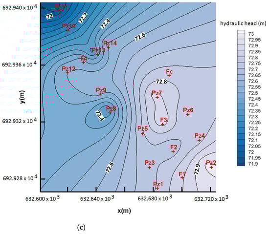 Based on hydro-geological knowledge, physical arguments, and piezometric analysis and interpretation, the hydrodynamic model is built in order to simulate the groundwater flow and to determine the distribution of the transmissivity values of the chalk aquifer in the HESB. The numerical process of achieving the objectives in this modeling expertise involves a series of procedures. They can be classified according to three principal steps: data collection; computer simulations, calibration, and analysis; and numerical results (Figure 4a–c). At the domain boundary and after hydrodynamic conditions, the piezometric values are imposed. Simulations are conducted in steady state with the reference values from 2016. The process of georeferenced nodes allows us to accelerate the modeling calibration (Figure 4b). This numerical method highlights an overlay between measured and computed hydraulic head, where the maximum recorded was 72.6 m and 71.92 m, respectively.