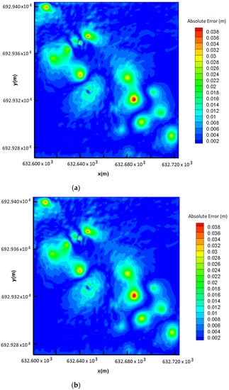 The HYSFLO-LBM/CMA-ES code identifies the distribution of the hydraulic conductivity (or transmissivity) and its possible heterogeneity (Figure 6a,b). It is for this reason that the proposed integrated optimization algorithm punctually identifies (point by point) the tensor . This step was carried out by solving an optimization problem of the variable as a real vector of components which corresponds to the total number of the computation grid nodes. It should be noted that the CMA-ES algorithm is a stochastic search algorithm affected by certain errors induced by the generation of individuals randomly. In order to reduce these errors, we carried out about ten simulations to consider, as the final value , only the average of these simulations. Consequently, Figure 6a,b shows, outside the diagonal band of the measurements, the heterogeneity of the hydraulic conductivity and of the tensor , but not of the random noises that could probably be interpreted by the reader.