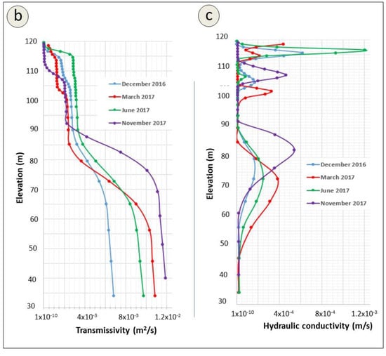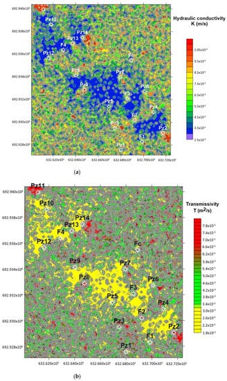Figure 6b shows lower, middle, and higher transmissivity values are about 0.0025, 0.0045, and 0.007 m2/s, respectively, but globally, the magnitude order is about m2/s. This variation is very heterogeneous in the hydrogeological experimental site and is represented by the spatial distribution of transmissivity values (Figure 6a).