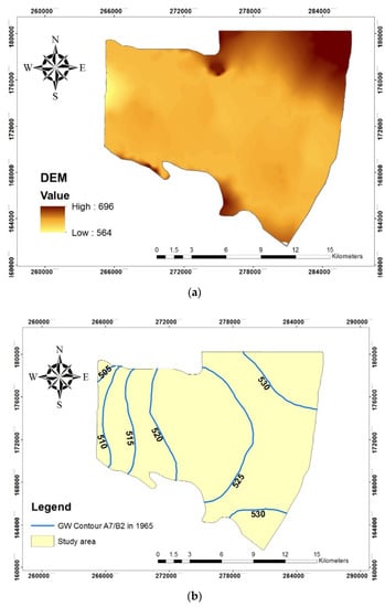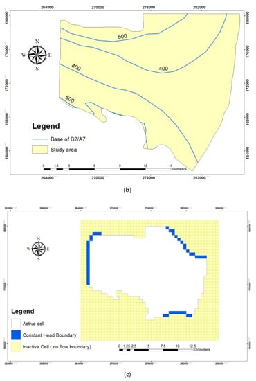 The domain of the model was set between 265,000, 160,000 (in the left lower corner), and 290,000, 180,000 (in the upper right corner) according to the Palestine Grid. The domain was discretized using 40 rows by 50 columns with a grid size of 500 m by 500 m, producing 2000 cells in the model layer. The topographical maps of the studied area and the base contour map of the B-B2/A7 formation are presented in Figure 4a,b. The top and bottom elevations of the model domain were derived from geological maps [57]. These values were compared to well-logs obtained from previously drilled wells throughout the study area. The B-B2/A7 formations have a thickness of approximately 516 m and 200 m, respectively.