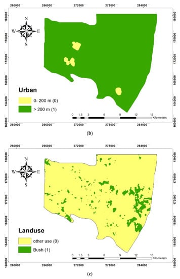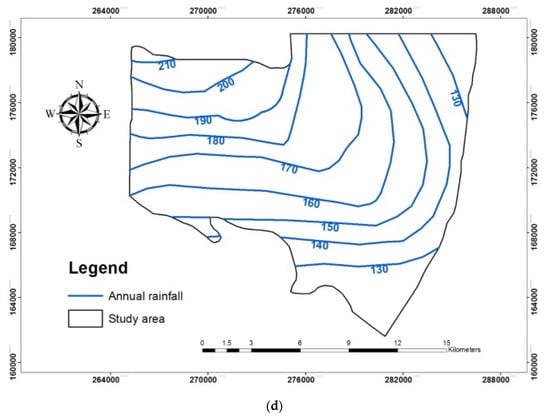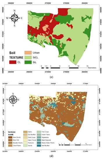 - The land use and vegetation types of the Dhuleil-Halabat area were obtained and updated from the MWI, which was produced in 1994 and updated in 2019 (Figure 2d).