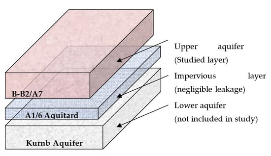 The processing Modflow (PM) version 8.0 was used to investigate the behavior and response of groundwater flow following GWRC with TWW [56]. The model was developed based on simplification or extraction of the complex physical reality and its processes. As the validity of the forecast data depends upon how close the model is to the actual field conditions, high-quality field data was used to validate the used model. The two aquifers in the Dhuleil- Halabat region (B-B2/A7 and Kurnub) were divided by the Lower Ajlun Aquitard (A1/6) layer, as shown in Figure 3. All the withdraws were assigned to B-B2/A7 formation, while the Kurnub aquifer in most parts of Dhuleil-Halabat was set off operation. Under such circumstances, the analysis is only conducted on the B-B2/A7 formation.