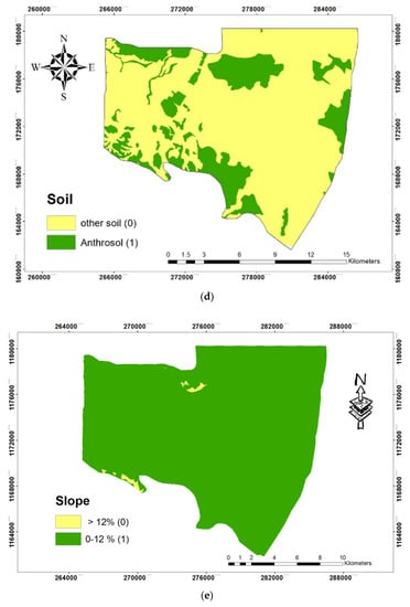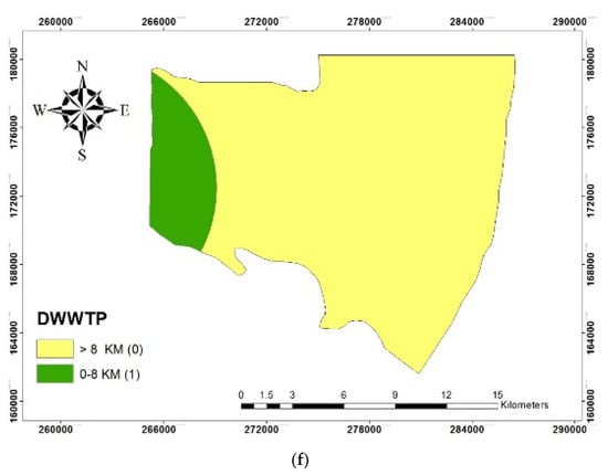 Figure 5 presents the six thematic maps categorized as water points (W.P.), urban areas (U.A.), land use (L.U.), soil type (T.S.), slopes (S), and WWTP distance (DWWTP) generated using ArcGIS 10.3 (spatial analysis tool). For each thematic map, the acceptable areas were coded as 1 and the rejected areas were coded as 0. Figure 5a,b present the environmental criteria which include a buffer area of 100 m radius for water consumption wells and a 200 m radius for the residential area, both of which were coded as 0. Figure 5c presents the slope thematic map for the study area, which was reclassified into two categories. The first category was related to the slopes with a value less than or equal to 12% (coded as 1), while the second category was related to the slopes with values >12% (coded as 0). The soil texture was identified as 1 for and 0 for the rest of the areas, as shown in Figure 5d. The suitable water table depth for GWRC must have a static G.W. level of at least 5 m below the ground to have a sufficient unsaturated zone for W.W. purification. Results showed all parts of the study area were considered suitable and coded as 1.