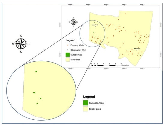 The land use thematic map of the studied area was produced considering all of the bush areas (i.e., uncultivated areas) as a suitable site for recharging and coded as 1 as presented in Figure 5e. The economic criteria include an 8 km buffer zone around the four WWTPs, which are coded as 1 as shown in Figure 5f. The raster GIS maps were generated using the raster calculator to create the suitability map for the GWRC basins (Figure 6). Table 3 outlines the suitable area for GWRC and the percentage from total area based on each criterion. It was observed that water point is suitable for about 97.86% of the total land area. Up to 99.5% of the studied area, ~267.29 km2 has the required slope, 97.97% of the studied area ~263.03 km2 has the required urban contribution, and 97.86% of the area (262.76 km2) has the right water points. However, only 55.56% of this land (≈149.19 km2) has the required soil texture, and just 7.96% of the land (18.68 km2) has a good opportunity in terms of close WWTP.