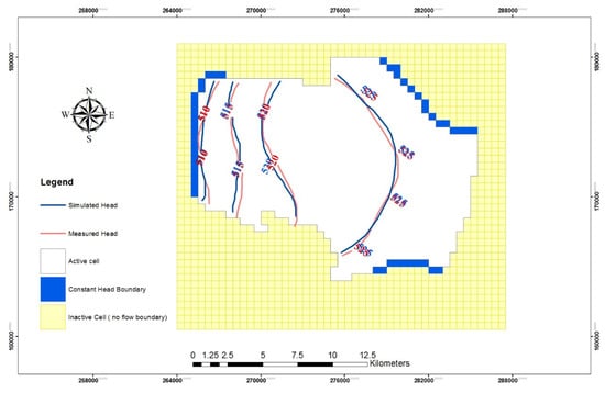 The model calibration was achieved through the trial and error method. The procedure includes adjusting the hydraulic parameters during the sequential runs and carrying out calculations until the computed water levels match the actual water level contours [60,61,62].