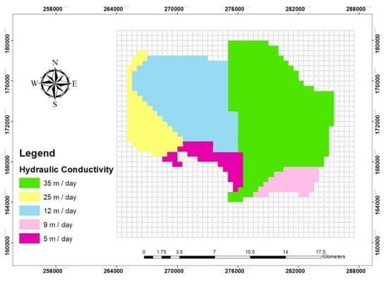 Figure 7 presents the comparison between the actual and the computed water level contour map for the B-B2/A7 formation in the Dhuleil-Halabat region produced by Modflow. Previously reported data on the HHK [51,53,55,58] and pumping tests [69] were used as initial values in the steady-state simulation. After that, the HHK values were continuously updated during the calibration process of the model. Results from the calibration phase revealed that the HHK values for the study area range between 5 and 35 m/day. Low conductivity values of 9 and 5 m/day were noticed on the south-central and south-west sides of the area (see Figure 8).