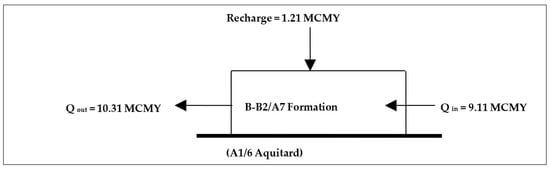 Conversely, high conductivity values ~35 and 25 m/day were observed in the East and West regions, respectively (Figure 8). The water balance for the B-B2/A7 formation at the steady-state conditions (Figure 9) indicates that the inflow is greater than the outflow by 0.01 MCMY with a discrepancy of 0.19%. The calculated total recharge amount for the study area was determined to be 10.32 MCMY (9.11 MCMY) with inflow from Jebal Al Arab and Azraq basin (i.e., southern constant head boundary (Figure 4c), and 1.21 MCM from the areal recharge. In contrast, the outflow from the eastern boundary towards Wadi Zarqa was determined to be 10.31 MCMY. In 1994, when the pumping reached 27.5 MCMY, a large amount of water flowing to pumping wells comes from G.W. storage. This causes a rapid decrease in the G.W. levels and creates a great hydraulic gradient around pumping wells. So, the hydraulic gradient forces G.W. to flow towards the pumping wells and reduces G.W. discharge to the western boundary, and creates recharge from the eastern and southern constant head boundary. With extra pumping and increasing the hydraulic gradient, the capture (low discharge and high recharge) increased and eventually equaled the pumping rate of 15.5 MCM in around 35 years as determined from Modflow calculations. In this situation, the capture sustains the pumping rate, and no more G.W. storage is removed. A new equilibrium state is achieved at a sustainable yield of 15.5 MCMY instead of 10.31 MCMY as calculated by steady-state calibration processes.