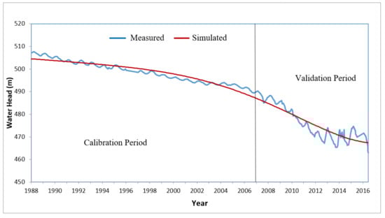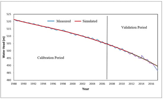 In the transient calibration, the simulated head and the HHK values that were obtained from steady-state calibration were used. The transient calibration was achieved by changing the specific yield and storage values. The transient calibration of the area was performed using the existing water-level data from two observation wells (AL1043 and AL2698) for the period 1989–2017. The available data for the period 1988–2008 was used for the model calibration, while the available data for the period 2009–2019 was used for the model validation.